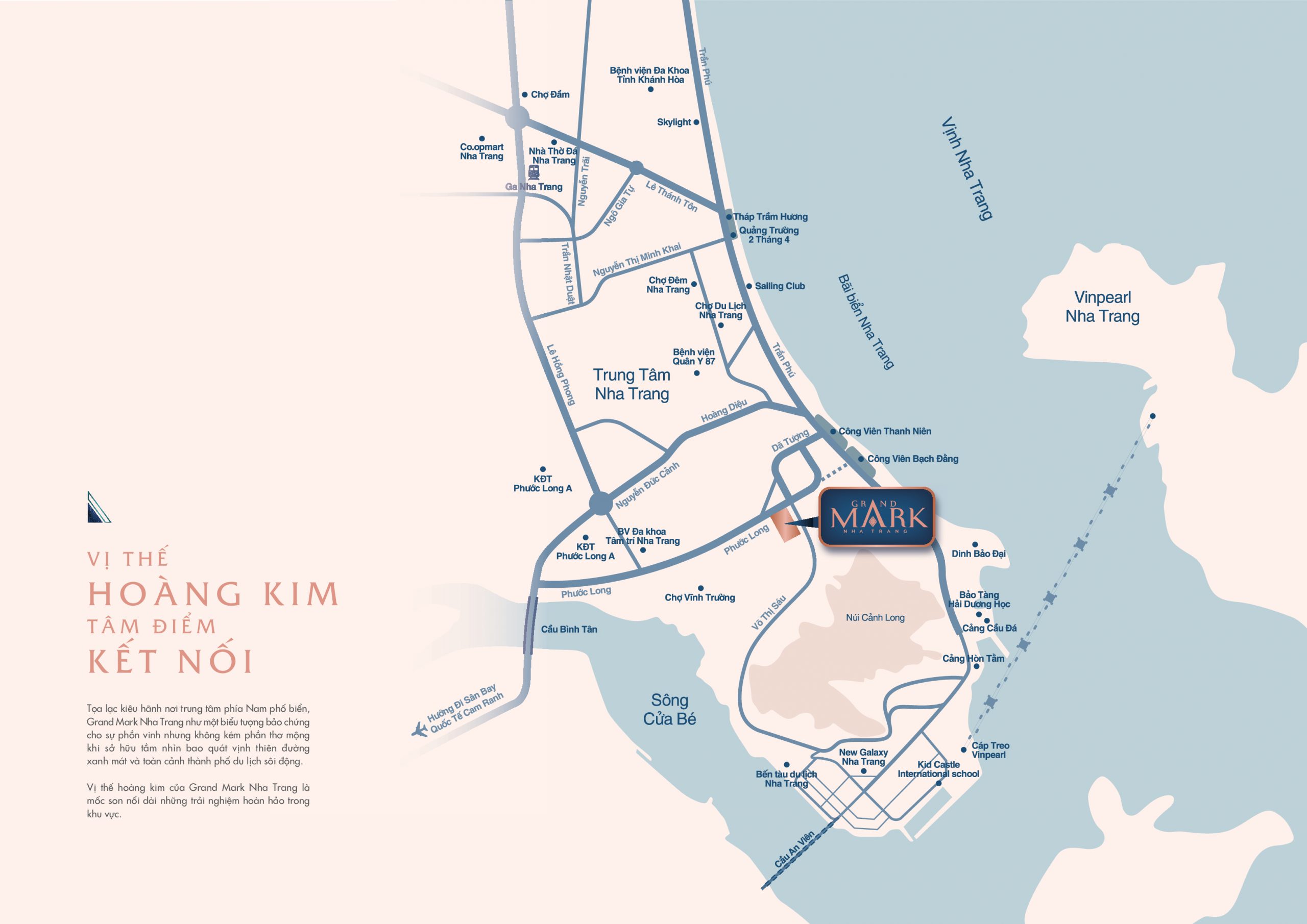 Grand Mark Nha Trang được xây dựng trên khu đất vành rộng hơn 1ha, đây là khu phức hợp gồm căn hộ chung cư cao cấp, thương mại, dịch vụ, văn phòng, shophouse, Penhouse. Dự án Grand Mark Nha Trang sở hữu vị trí phong thủy với 4 bên là sông- núi- biển bao quanh, dự án giúp hiện thực hóa giấc mơ an cư cao cấp bên Vịnh Ngọc. Tọa lạc tại trung tâm phía Nam Nha Trang, Căn hộ Grand Mark Nha Trang đáp ứng nhu cầu sinh sống học tập làm việc đến giải trí, nghỉ dưỡng. Nội khu dự án hội tụ chuỗi tiện ích phong phú gần gũi với thiên nhiên kiến tạo cuộc sống vương giả, giúp dân cư vừa tận hưởng cuộc sống vui vẻ giữa trung tâm thành phố, vừa học tập và làm việc tại đây. Dự án Grand Mark Nha Trang được ra mắt trong bối cảnh thị trường bất động sản khan hiếm căn hộ, Grand Mark Nha Trang không chỉ góp phần bổ sung nguồn cung cho chuỗi căn hộ cao cấp ven biển mà với việc hội tụ đủ đầy về địa thế, pháp lý, chất lượng, dự án hứa hẹn trở thành biểu tượng mới của phía Nam thành phố Nha Trang.