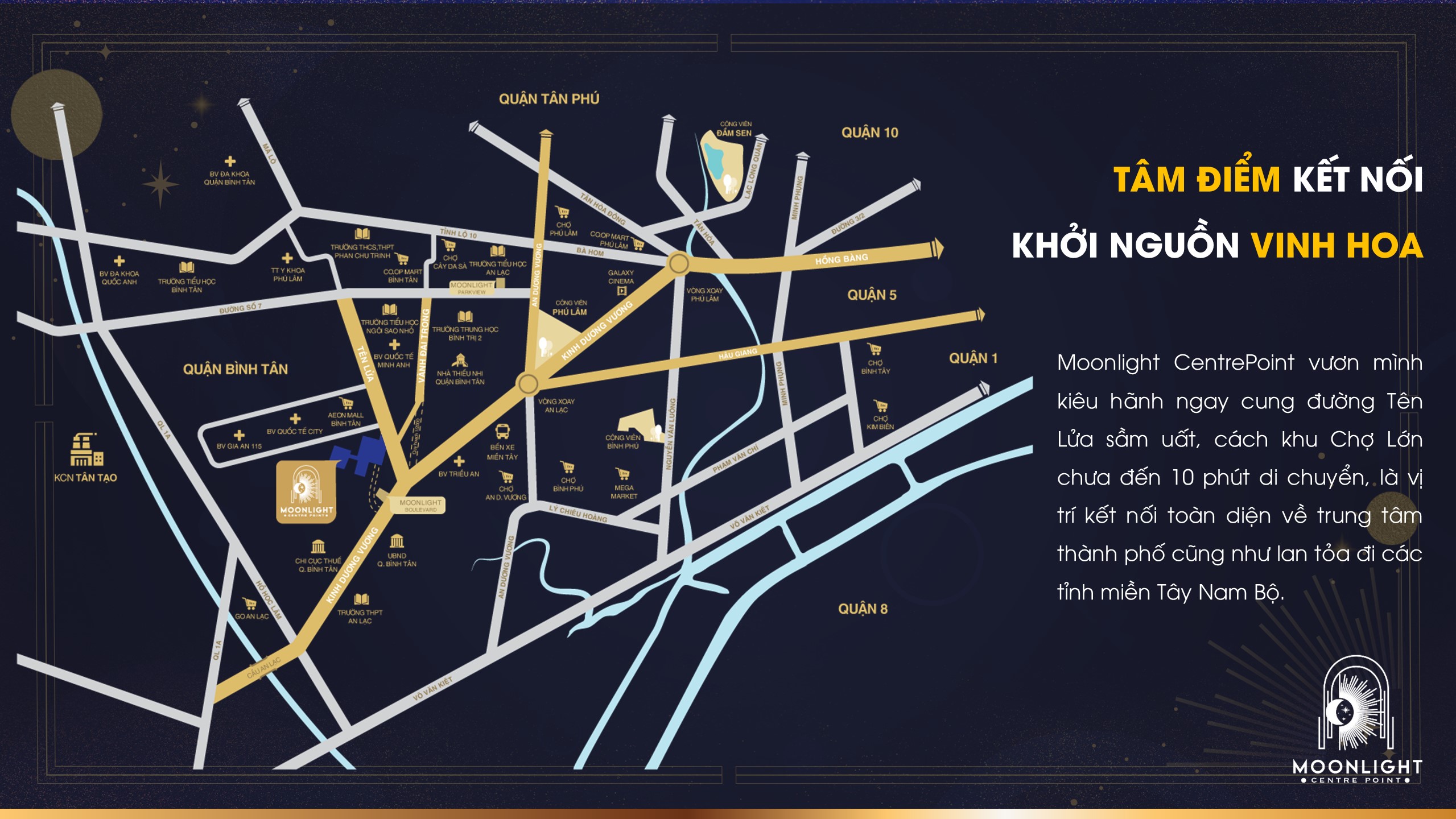 Tiếp nối sự thành công rực rỡ và viết tiếp câu chuyện an cư qua chuỗi dự án mang tên thương hiệu Moonlight – Moonlight Park View và Moonlight Boulevard. Siêu phẩm tiếp theo của Tập đoàn Hưng Thịnh – Moonlight Centre Point – Tên Lửa sở hữu vị trí “Kim Cương” mặt tiền đường Tên Lửa, cạnh bên Aeon Bình Tân – tọa lạc lại trung tâm Khu Tên Lửa, nơi được ví như “Phú Mỹ Hưng của Khu Tây” và được xem là đắc địa nhất với hệ thống tiện ích có quy mô lớn nhất quận Bình Tân. Như làn gió mới mang đến phồn vinh, nơi đây sẽ giúp quý khách hàng thỏa mong ước an cư lạc nghiệp khi quỹ đất nội đô ngày càng khan hi Sống tại khu căn hộ cao cấp Moonlight Centre PointHưng Thịnh đường Tên Lửa, quý khách sẽ được tận hưởng toàn bộ tiện ích chỉ cách một bước chân.