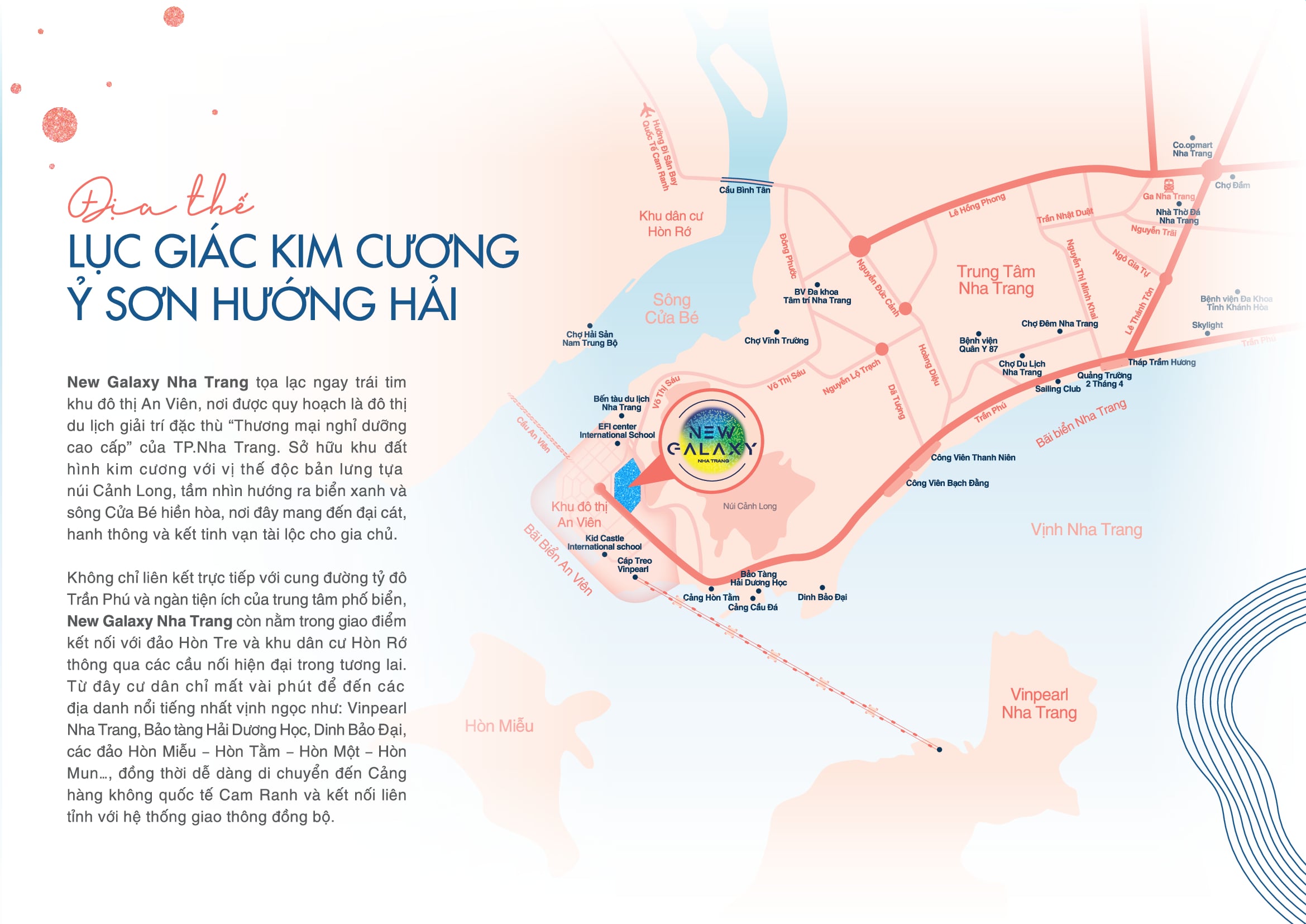Tiếp nối dòng siêu phẩm căn hộ New Galaxy từ Hưng Thịnh Land, dự án Căn hộ biển New Galaxy Nha Trang – căn hộ nghỉ dưỡng cao cấp Sở hữu lâu dài bên vịnh ngọc với quy mô lớn nhất tại thành phố Nha Trang hiện tại, sở hữu cảng biển, bến du thuyền, hồ bơi, bãi tắm riêng đều lấn biển. Hiện nay được Tập đoàn BĐS Hưng Thịnh – 1 trong những Tập đoàn BĐS hàng đầu tại Việt Nam làm chủ đầu tư, phát triển, phân phối và xây dựng. Dự án New Galaxy Nha Trang là khu nghỉ dưỡng cao cấp đầu tiên tại Việt Nam có cảng biển riêng. Giấc mơ về cuộc sống trên bờ biển, một ngôi nhà trong mơ với bến thuyền cho riêng mình để trở thành hiện thực dành cho những chủ nhân tương lai của Khu đô thị An Viên – đẳng cấp bậc nhất Nha Trang.