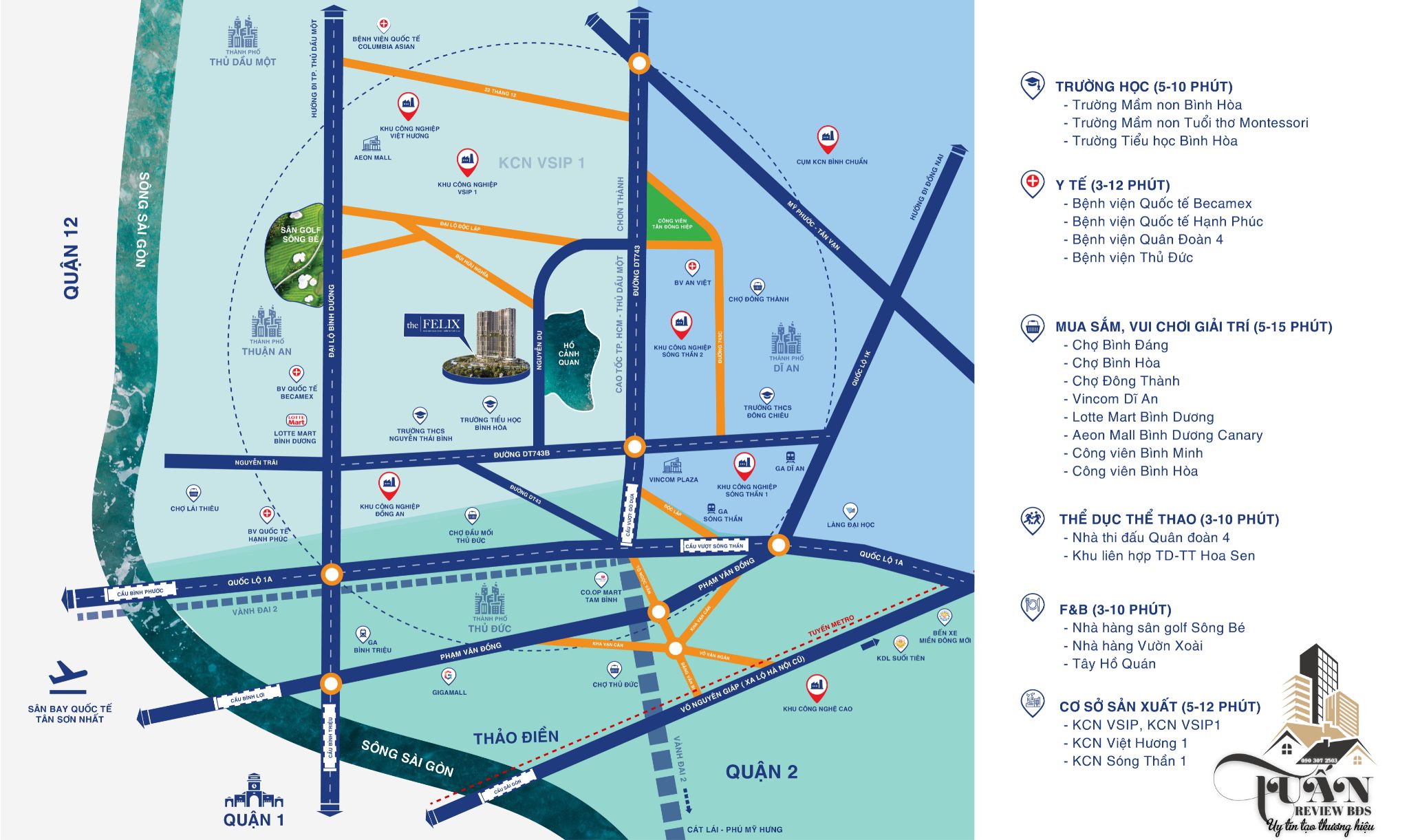 Vị trí dự án Căn hộ The Felix tọa lạc ngay tại Nguyễn Du, Bình Hòa, Thuận An, Bình Dương đoạn đường huyết mạch nối liền giữa Bình Dương và Thành phố Hồ Chí Minh ngày một được đầu tư hạ tầng giao thông hiện đại nên chỉ mất chưa tới 20 phút đã tới được trung tâm Tp Hồ Chí Minh. Ngoài ra còn liền kề các trục đường giao thông quan trọng như là: Quốc Lộ 13, Quốc lộ 1A, Phạm Văn Đồng,… Không những thế cư dân căn hộ The Felix còn dễ dàng tiếp cận nhiều khu vực trọng yếu của vùng như là: cách Vincom Plaza , trường học, bệnh viện quốc tế, trung tâm thương mại chỉ 3-10 di chuyển.