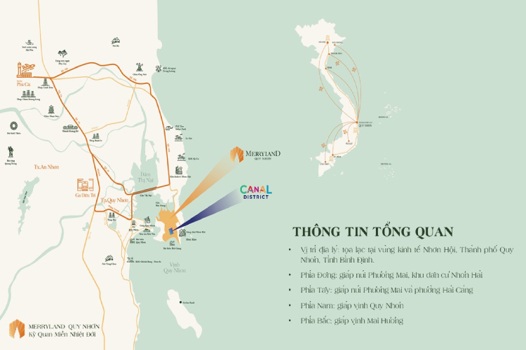 Vị trí của dự án Merry Land Quy Nhơn vừa kết nối dễ dàng từ thành phố Quy Nhơn bằng đường cáp treo, đường thủy (du thuyền), đường bộ (qua cầu Thị Nại) vừa kết nối trực tiếp với sân bay Phù Cát theo tuyến đường mở rộng QL19B thay vì di chuyển theo QL1A hiện nay.
